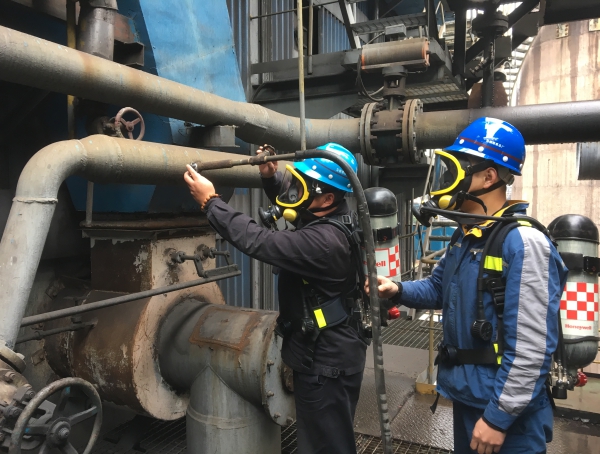 此次演練以2號(hào)35t/h鍋爐高爐煤氣泄露為背景。當(dāng)突發(fā)高爐煤氣泄露事故時(shí),崗位員工能迅速發(fā)現(xiàn)泄露點(diǎn),及時(shí)匯報(bào)應(yīng)急指揮小組和相關(guān)部門(mén),并迅速穿戴好空氣呼吸器等安全裝備進(jìn)行應(yīng)急救援處理,并根據(jù)泄漏點(diǎn)大小和風(fēng)向等確認(rèn)高爐煤氣的擴(kuò)散范圍、做好危險(xiǎn)區(qū)域警戒,進(jìn)而科學(xué)有序地分步驟做好后續(xù)各項(xiàng)應(yīng)急應(yīng)對(duì)舉措。