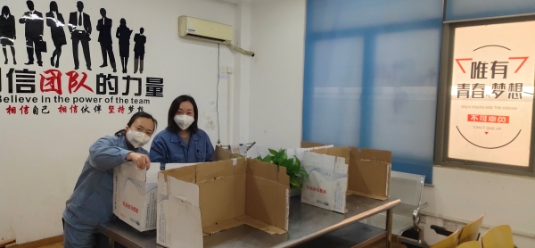 自疫情爆發以來,重機分公司實行分餐制,廠里職工在休息室用工作餐。員工在休息室中用餐,每個人間隔的不遠,為降低用餐時間因無防護措施造成群體感染的風險,基層單位就地取材,利用焊絲包裝盒,制作簡易隔斷罩。女工馮瑛和同事接到這個命令,馬上行動,為了達到一個人在里面吃飯不憋又能有效隔段的效果,她倆反復實驗比對效果,嘗試各種方案,最終才一致選定用兩個焊絲盒組成的隔斷罩樣式,并按照桌面大小每個工作餐桌放了4-6個隔離罩。這樣保證了每位員工在用餐時都能舒適,安全的用餐。在完成全部隔離罩的制作安裝后,認真的對每個隔斷都做好了消毒工作。對她們而言革命尚未成功,現在乃至疫情結束前她們的每天堅守崗位的同時還犧牲了午休時間對每個隔斷進行細致的消毒,是她們用耐心和責任心把疫情區隔在工業園之外。