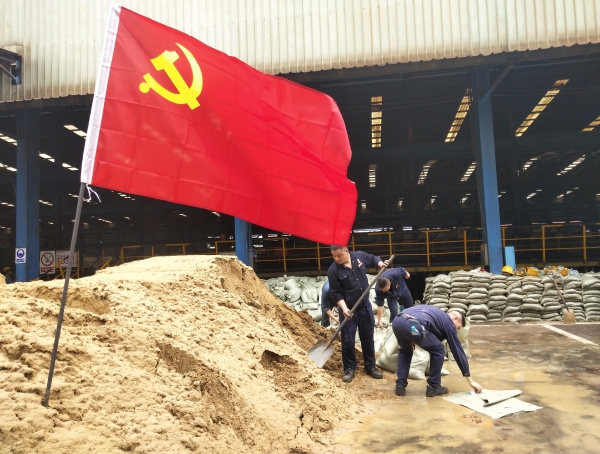 方大九鋼軋鋼廠黨員突擊隊(duì)正在裝沙袋