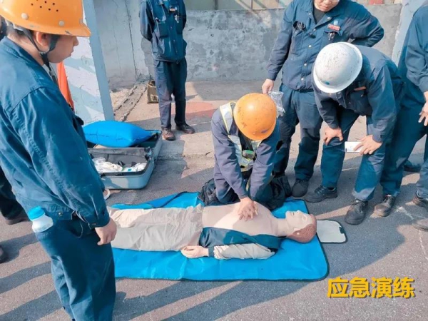 演練模擬該公司中板油庫門外油桶發生火情,現場人員馬上開始滅火并打電話向廠部匯報,廠部立即啟動應急預案通知相關部門,隨即搶險救援小組開始佩戴空氣呼吸器進入火災現場對暈倒人員進行搶救,對可能擴大火勢的物資進行轉運至安全區域,動力廠煤防站到現場對暈倒人員進行心肺復蘇搶救,保衛部消防車到現場進行火災現場封鎖、火情確認、確定撲救方法、鋪設水帶撲滅火災,并進行人員清點、損失統計。演練中每個步驟都井然有序。