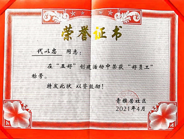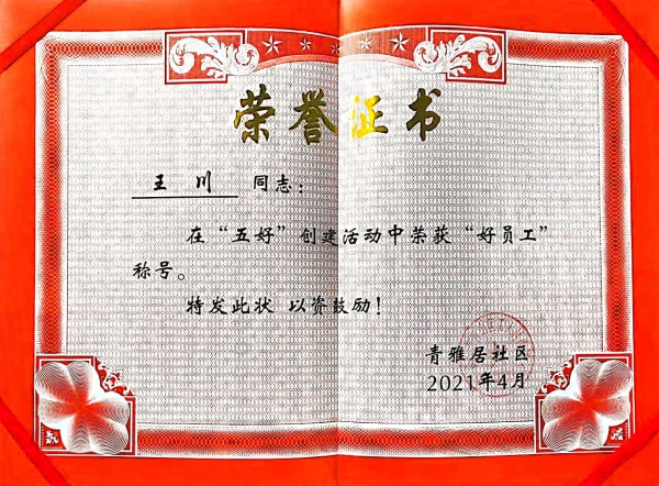 據(jù)悉,為貫徹落實(shí)好青山區(qū)委區(qū)政府“黨建引領(lǐng) ‘五好’創(chuàng)建”活動(dòng),弘揚(yáng)勞模精神、勞動(dòng)精神、工匠精神,青山區(qū)總工會(huì)在全區(qū)組織開(kāi)展在單位爭(zhēng)做“好員工”的創(chuàng)建活動(dòng)。在此次青雅居社區(qū)“好員工”評(píng)選活動(dòng)中,共有30個(gè)獲獎(jiǎng)名額,其中公司2名員工獲獎(jiǎng),代表了當(dāng)?shù)厣鐓^(qū)對(duì)五冶人