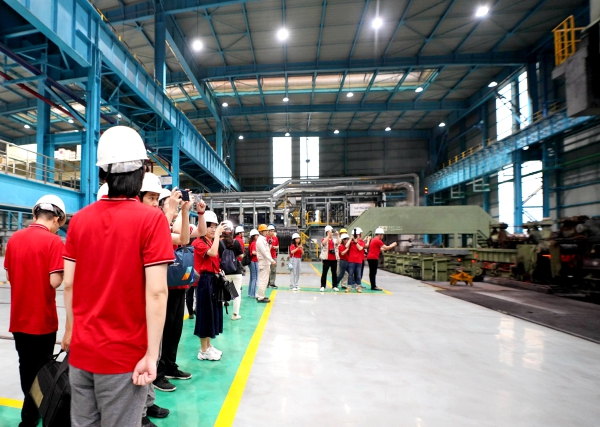 高三線是韶鋼戰略轉型的重點工程,于2020年7月建成投產,具備生產Ф5.5mm-50mm規格的盤卷能力,可滿足客戶對工業線材的不同需求,以冷鐓鋼、彈簧鋼、齒輪鋼、軸承鋼等中高端工業用材生產為主。產線具備交貨快、運輸便捷、發揮長材集聚效應等優勢。高三線大量采用當今國內外智慧制造先進技術,從加熱爐到產品收集區,全線無一操作室,完全實現遠程集控,正努力打造成行業智慧制造示范產線。記者們參觀了高三線展廳,并深入現場一線采訪,感受高三線規范有序的現場管理和先進的生產工藝技術。