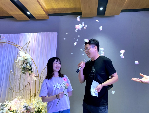 美妙的時光總是短暫的,最后到了激動人心的投票及牽手表白環節。根據男生女生互表感情投票,選出了最受歡迎心動男生、女生,并有3對青年男女當場成功牽手。甜蜜告白墻前,男嘉賓拿著手上的玫瑰,大膽地對心儀女生進行表白,“感謝公司搭建這么好的平臺,讓我認識了你,如果有機會,我想余生都是你。”臺下響起了熱烈歡快的掌聲。