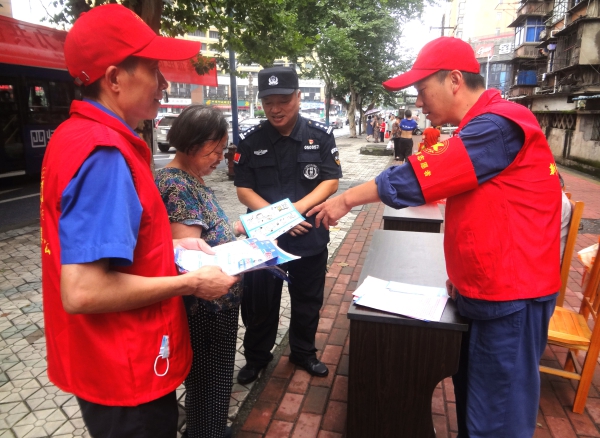 圖為志愿者在社區發放防詐騙小冊子