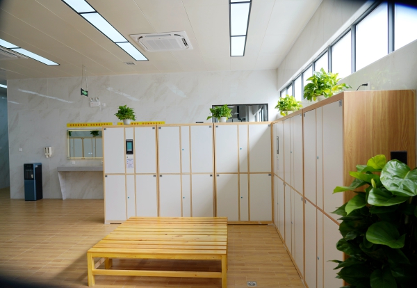 韶鋼鋼后浴室建筑面積約500m2,設(shè)有男浴位60個、女浴位10個。配備洗衣智能收發(fā)衣柜200個。每天最大容量可供約600人使用(分3場)。浴室外由舊備件構(gòu)成“100”字樣,彰顯此項目是向慶祝建黨100周年的獻禮。男浴室內(nèi)設(shè)70個人臉識別智能儲物柜,安裝觸摸感應(yīng)電加熱防霧鏡2面,女浴室內(nèi)設(shè)15個人臉識別智能儲物柜,安裝觸摸感應(yīng)電加熱防霧鏡1面。