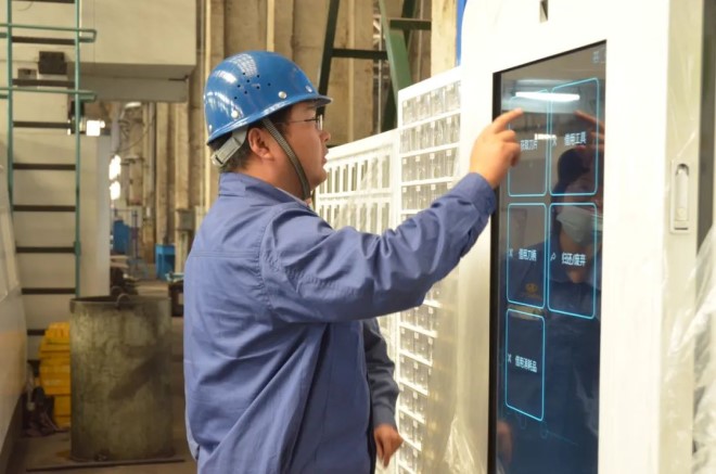 進入機械制造分廠的廠房,便能看到一個外觀特別像自動售貨機一樣的機器——智能刀具庫。刀具庫左側的櫥窗里,陳列著各種型號的刀片、刀具,右側則是一個碩大的顯示屏,既可以觸屏輸入名字密碼登錄,也可以進行面部識別登錄。近期,由于疫情防控的要求,大家都戴著口罩,無法進行面部識別,班長王同勇在刀具庫上進行了觸屏操作,輸入名字和密碼后,通過檢索、確認,領到了他們班組加工下個工件所需要的刀片。