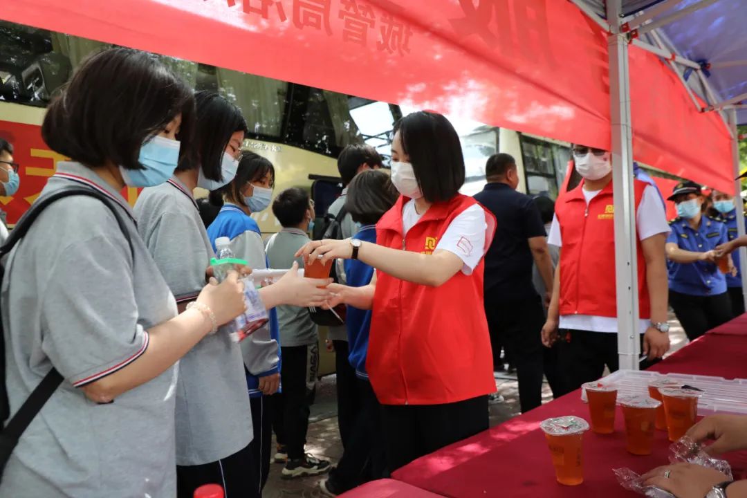 “不用緊張,好好考。”“加油,一定要相信自己!”“紅馬甲”溫情地送上鼓勵的話語、礦泉水及綠豆湯,鼓勵考生放平心態(tài)、沉著應(yīng)考,用實(shí)際行動為考生加油。
