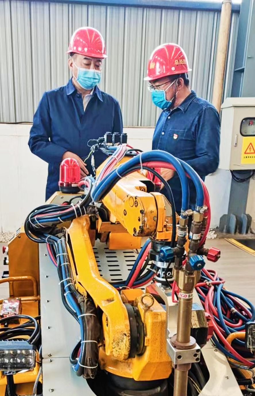 威猛股份總經理王思民(左1)陪同新鄉市領導視察公司研發的焊接機器人“小萌”