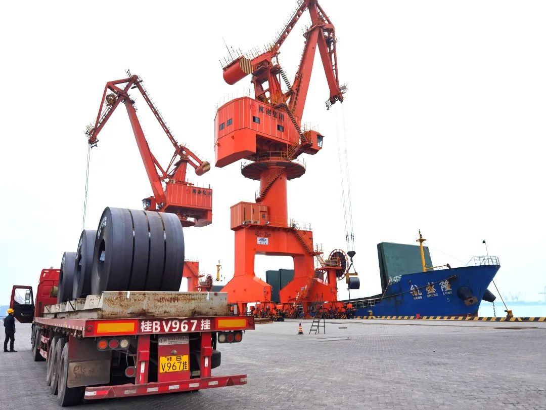 防城港廣西鋼鐵基地萬(wàn)噸碼頭調(diào)運(yùn)現(xiàn)場(chǎng),拉運(yùn)成品鋼材的卡車往來(lái)不絕,或運(yùn)送鋼材出入,或停車排隊(duì)等待吊裝。幾臺(tái)行車、吊機(jī)協(xié)同作業(yè),低沉的機(jī)器轟鳴聲和指揮行車的哨聲交織在一起,像是在協(xié)奏激昂的生產(chǎn)交響曲。