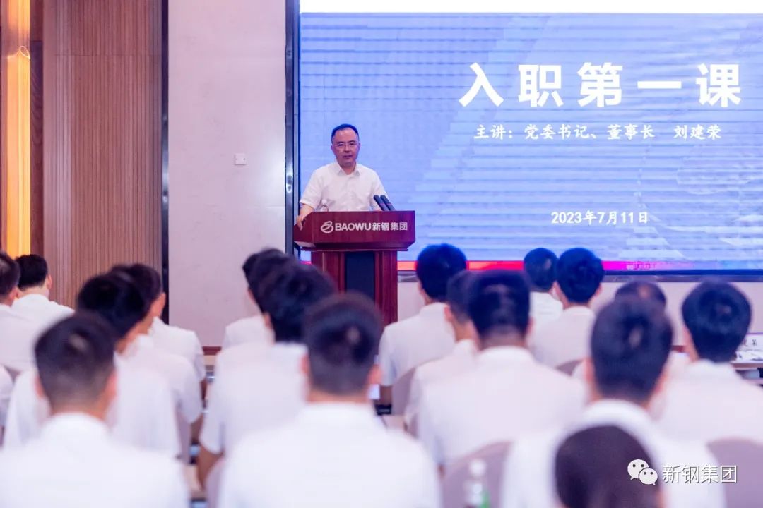 新鋼集團黨委書記、董事長劉建榮在開班儀式上為新進大學生講授入職第一課。