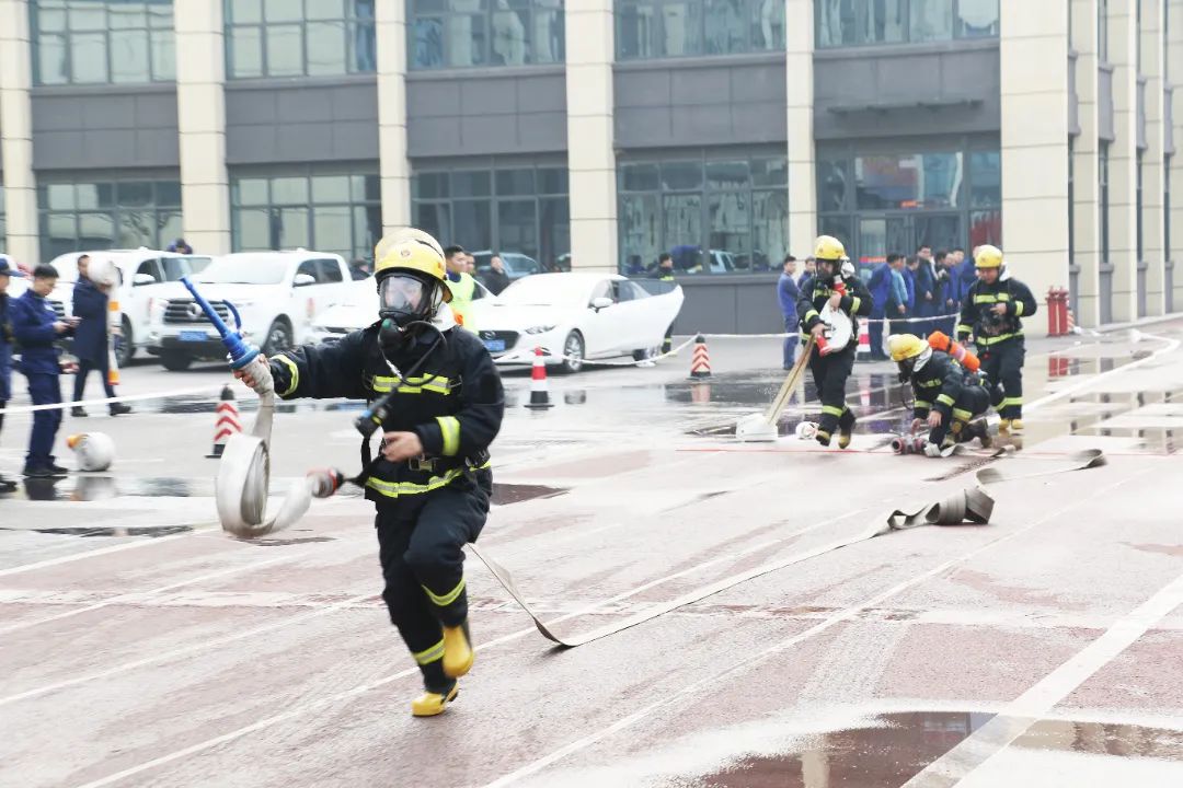 在“手抬機(jī)動(dòng)泵單干線出一支水槍操”技能比拼現(xiàn)場,重慶鋼鐵參賽隊(duì)員五人一組,默契配合,在裁判員的哨聲響起后,快速?zèng)_向賽道。