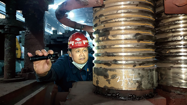 圖為李生正在檢查軋輥。