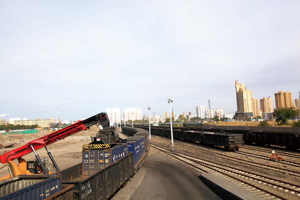圖為裝滿焦炭集裝箱的火車正在烏鋼卸貨。