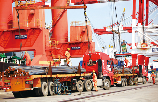 圖為運(yùn)輸車倒運(yùn)烏鋼產(chǎn)品準(zhǔn)備裝船。