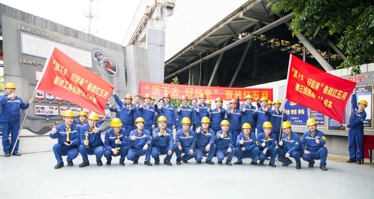 號角一聲風雷動,三軍發軔啟征程。兩條產線的負責人分別鄭重地接過目標旗,鮮艷的目標旗在空中舞動,他們表明態度,立下軍令壯,勢必要在“紅五月”鉚足干勁,拿下板材工序、棒三工序的挑戰目標,共同打贏“紅五月”生產保衛戰。