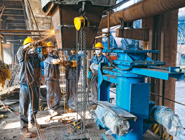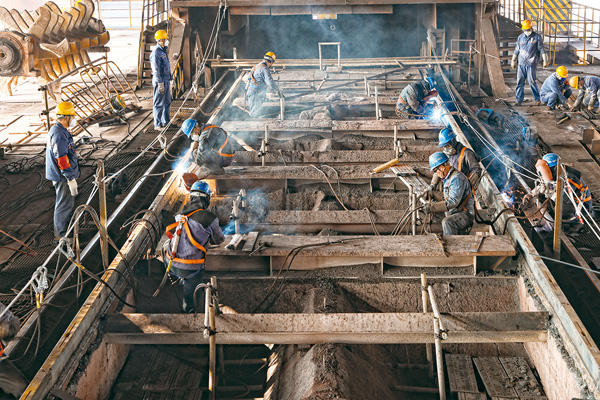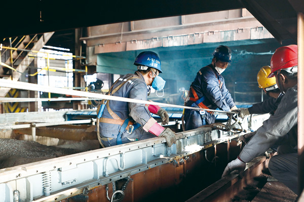 圖為檢修人員在拆除燒結(jié)機原固定滑道。