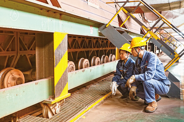 圖為該事業(yè)部職工在巡查,觀察整改后的燒結(jié)機臺車滑道是否漏風。