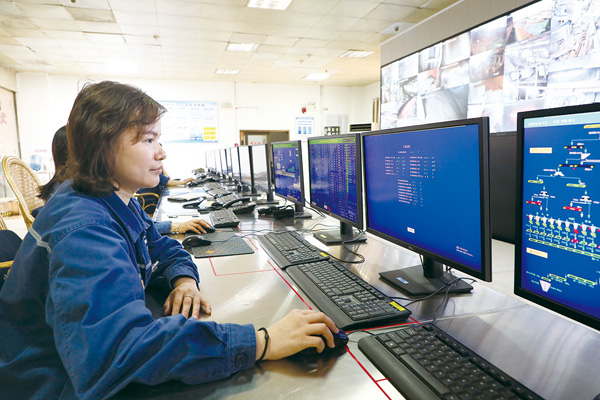 圖為燒結(jié)機主控工在電腦屏幕上查閱燒結(jié)機生產(chǎn)過程中的含氧量。