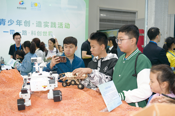圖為參觀人員觀看火星科考車模型。這個(gè)模型是由北京市豐臺(tái)區(qū)外國(guó)語學(xué)校的學(xué)生歷時(shí)3個(gè)多月設(shè)計(jì)的,可以“眼觀六路,耳聽八方”,實(shí)現(xiàn)自動(dòng)避障和智能定位。