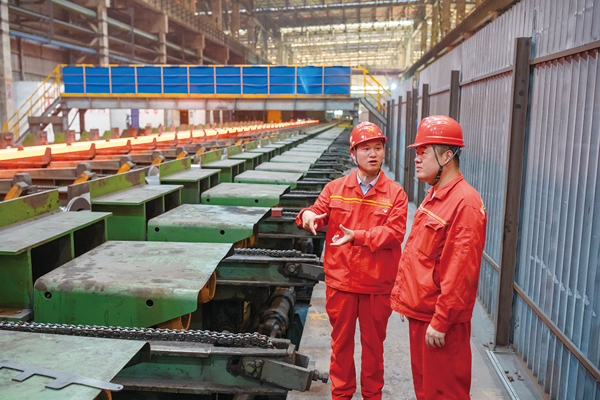 圖為掛職人員馮園園(左)正在軋機旁與現(xiàn)場設(shè)備人員(右)探討系統(tǒng)供電穩(wěn)定等問題。