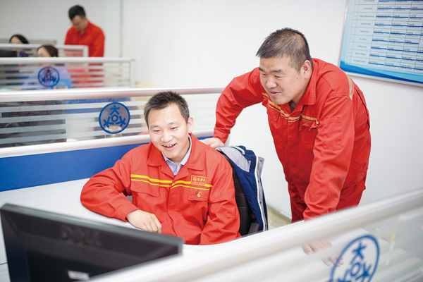 圖為馮園園(左)在東北特鋼股份與同事探討大型材軋機設(shè)備運行參數(shù)。