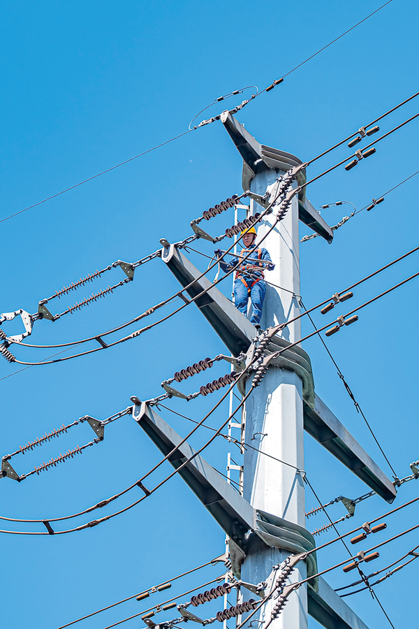 圖為組員于洋攀爬到塔頂巡檢。他說(shuō)每次到塔頂巡檢都會(huì)有一種“飛翔”的感覺(jué)。
