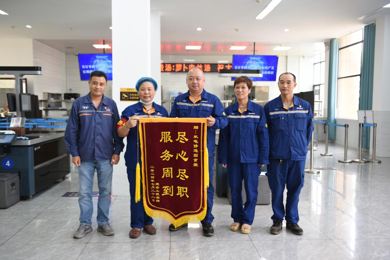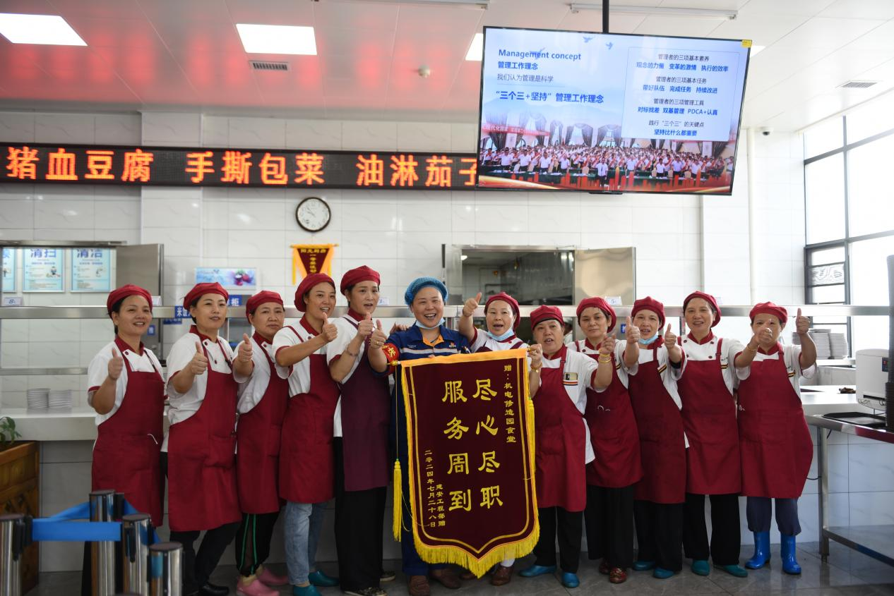 當問及王書記為何會想到送錦旗之事時,他滿是高興地說:“近幾個月來,我們維檢中心建安工程隊的主責主業是服務主體生產單位的,并且是為生產單位提供保障的。日常性事務繁忙,每天中午都要召開調度會,經常耽誤我們工程隊干部和員工的正常用餐時間,有時接近中午一點才來食堂用餐。食堂方面不但沒有怨言,還想方設法提供暖心的服務,甚至還為部分員工提供稀飯、豆漿、包子、饅頭等個性化服務。這個讓我們在每天的食堂用餐時,充分感受到了食堂方面在服務和菜品上都是費心費力的,并讓我們深切感受到了‘有溫度、有人文、有關懷’大家庭的溫暖。所以我們也想到了要用送一面錦旗的方式,來表達一下大家內心的感激之情,也能表達我們與兄弟單位的友情。”