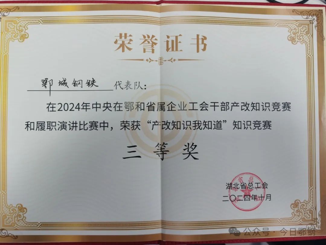10月13日,在湖北省總工會組織的中央在鄂和省屬企業(yè)產(chǎn)改知識競賽上,鄂鋼代表隊勇奪三等獎。