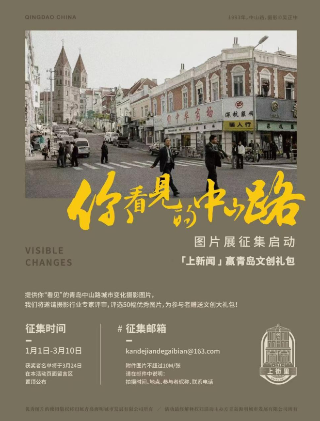 在中山路漫步“看得見的改變”圖片展,可以一覽城市更新前后中山路的全貌,從建筑風格的變遷到街道氛圍的變化,每一張攝影作品,都彰顯著中山路的日常變遷。同時,該展覽以影像為媒向影像創作者發出中山路圖像征集的邀約,征集活動將評選50幅優秀攝影圖片,并有機會贏取青島文創禮包,征集時間為2025年1月20日至2025年3月10日,征集郵箱為kandejiandegaibian@163.com,獲獎名單將于3月24日在上街里小紅書賬號頁面留言區置頂公布。
