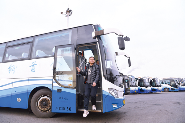 郭佳寧(右二)在北京首鋼廠東門坐上通勤班車,經過4小時、約270公里的車程,抵達位于河北曹妃甸的首鋼京唐公司。對他來說,這是不足為奇的工作日常。圖為郭佳寧排隊踏上班車。