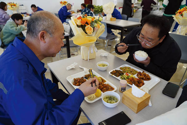 圖為勞模先進職工家屬體驗職工食堂的日常午餐,幫助他們感受企業(yè)大家庭的溫暖。