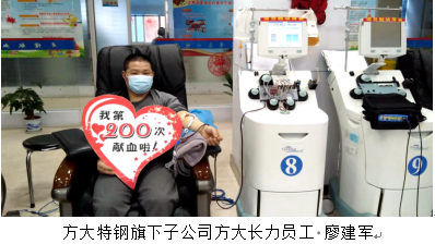 此外,該公司不少員工還自發(fā)自愿地參加社會(huì)獻(xiàn)血活動(dòng),如“丈夫偷偷獻(xiàn)血,妻子發(fā)現(xiàn)后陪他獻(xiàn)血20多年”的方大特鋼軋鋼廠員工萬建林、李月蘭夫婦;萬建林、李月蘭、謝永春、廖建軍曾榮獲全國無償獻(xiàn)血奉獻(xiàn)獎(jiǎng)終身榮譽(yù)獎(jiǎng);吳定均榮獲全國無償獻(xiàn)血奉獻(xiàn)獎(jiǎng)金獎(jiǎng);方大特鋼“80后”退伍軍人溫秋波被中國造血干細(xì)胞捐獻(xiàn)者資料庫管理中心授予“捐獻(xiàn)造血干細(xì)胞”榮譽(yù)證書。他們定期獻(xiàn)血,撐起了眾多患者的生命和家庭的幸福。
