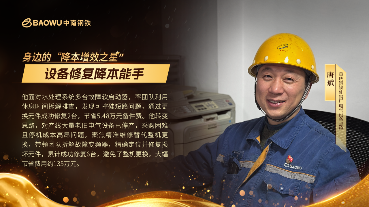 在重慶鋼鐵厚板產(chǎn)線,唐斌背著點檢包的身影時常穿梭于廠房之間。電氣室、液壓站、軋機平臺……哪里設(shè)備需要“診治”,他的身影就出現(xiàn)在哪里,他的身影總是定格在設(shè)備故障的第一現(xiàn)場 —— 這個被工友稱為 “行走的備件醫(yī)生” 的年輕人,正用雙手為老舊設(shè)備注入新生,在修舊利廢的戰(zhàn)場上書寫降本傳奇。