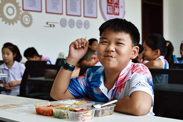 圖為托管班的孩子在就餐時面對作者的鏡頭露出開心的笑容。