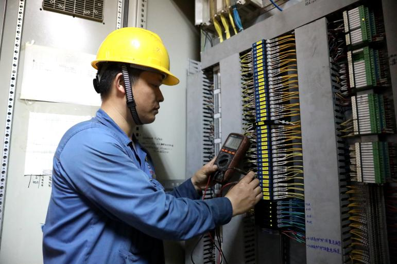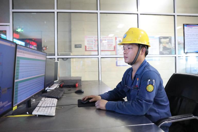 汪彬與同事在煉鐵廠2號高爐主控配電室進行點檢