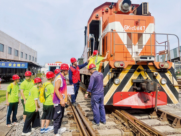 圖為廣西鋼鐵職工子女參觀運(yùn)輸機(jī)車。