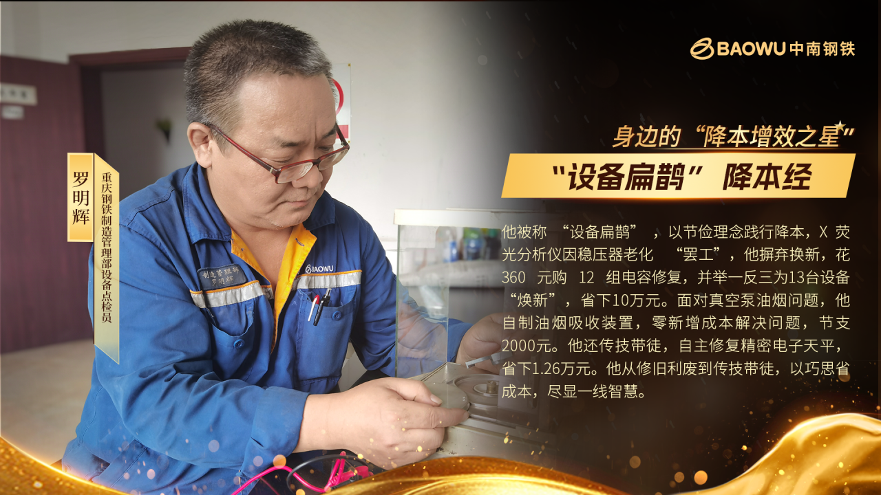 拿著萬(wàn)能表排查配電箱時(shí),羅明輝的眼神總透著股執(zhí)拗 —— 這位同事口中的 “設(shè)備扁鵲”。生活里節(jié)儉到工裝洗得發(fā)白也不換,對(duì)待車(chē)間里的設(shè)備 “老伙計(jì)”,卻有著物盡其用的別樣 “大方”?!白屆颗_(tái)設(shè)備都發(fā)揮最大價(jià)值,才是真降本”,這份樸素信念,成了他在一線啃下成本硬骨頭的底氣。今天,讓我們走進(jìn)重慶鋼鐵制造管理部,一起聽(tīng)聽(tīng)羅明輝的降本故事~~