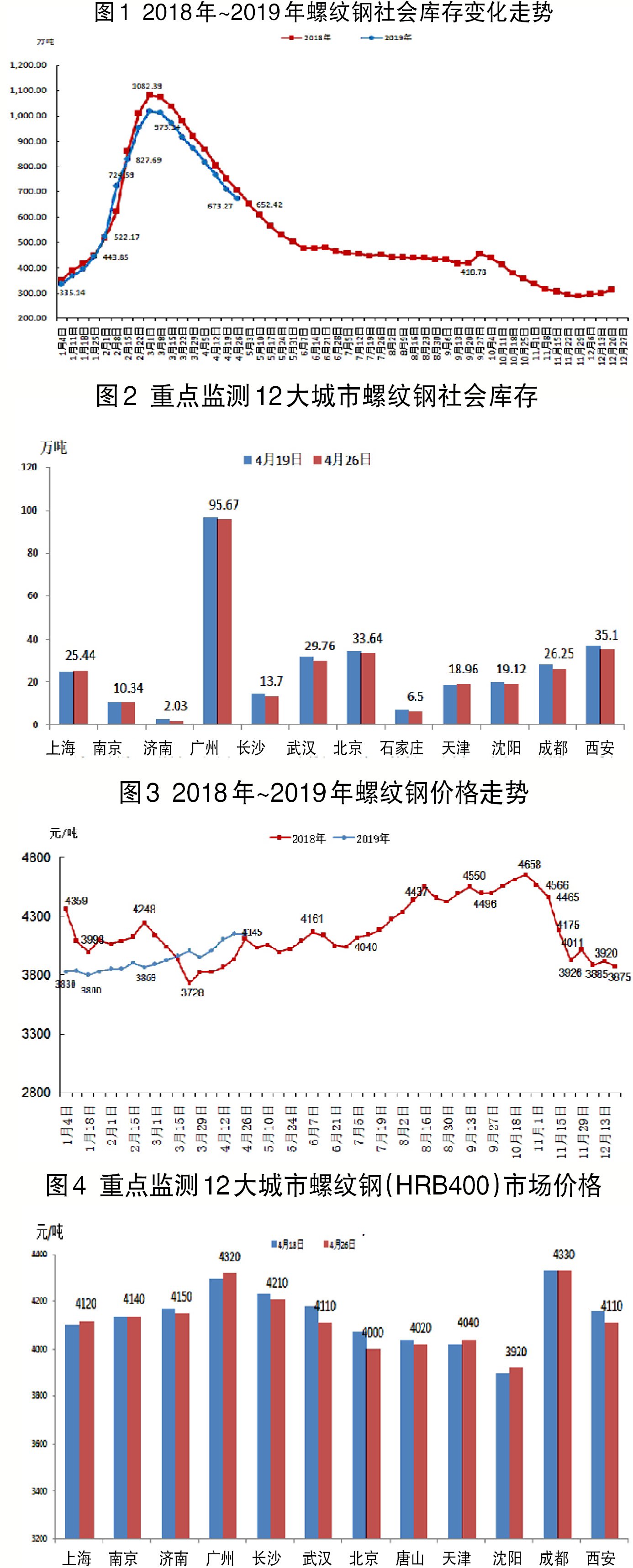 4月22日~4月26日,螺紋鋼社會庫存為673.27萬噸,環比下降35.82萬噸,降幅為5.32%。重點監測的12個城市庫存除上海、天津外均下降,其中武漢、西安、成都等城市庫存下降較大。