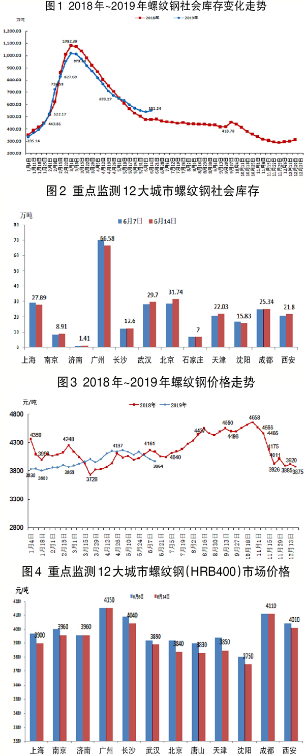 6月10日~6月14日,螺紋鋼社會庫存為551.24萬噸,環比上升12.23萬噸,升幅為2.22%。重點監測的12個城市庫存升降不一,其中北京上升較大,廣州下降較大。
