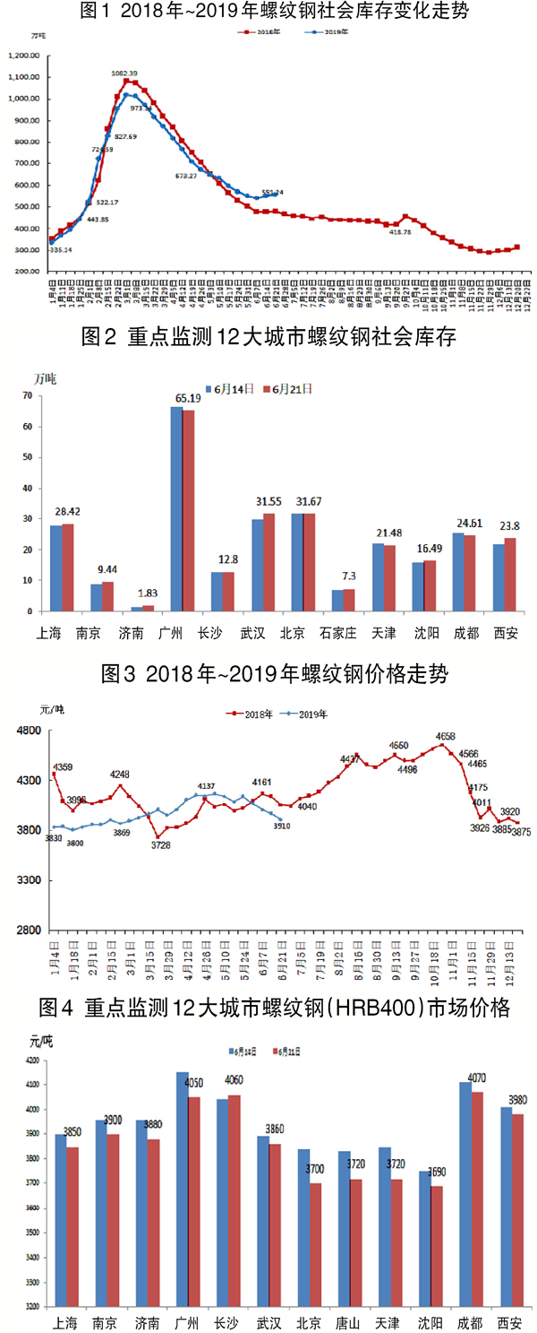 本周(6月17日~6月21日),全國螺紋鋼平均價格為3910元/噸,環比下降54元/噸,降幅為1.36%。重點監測的12個城市價格均下降,其中天津、北京、唐山等城市價格下降較大。