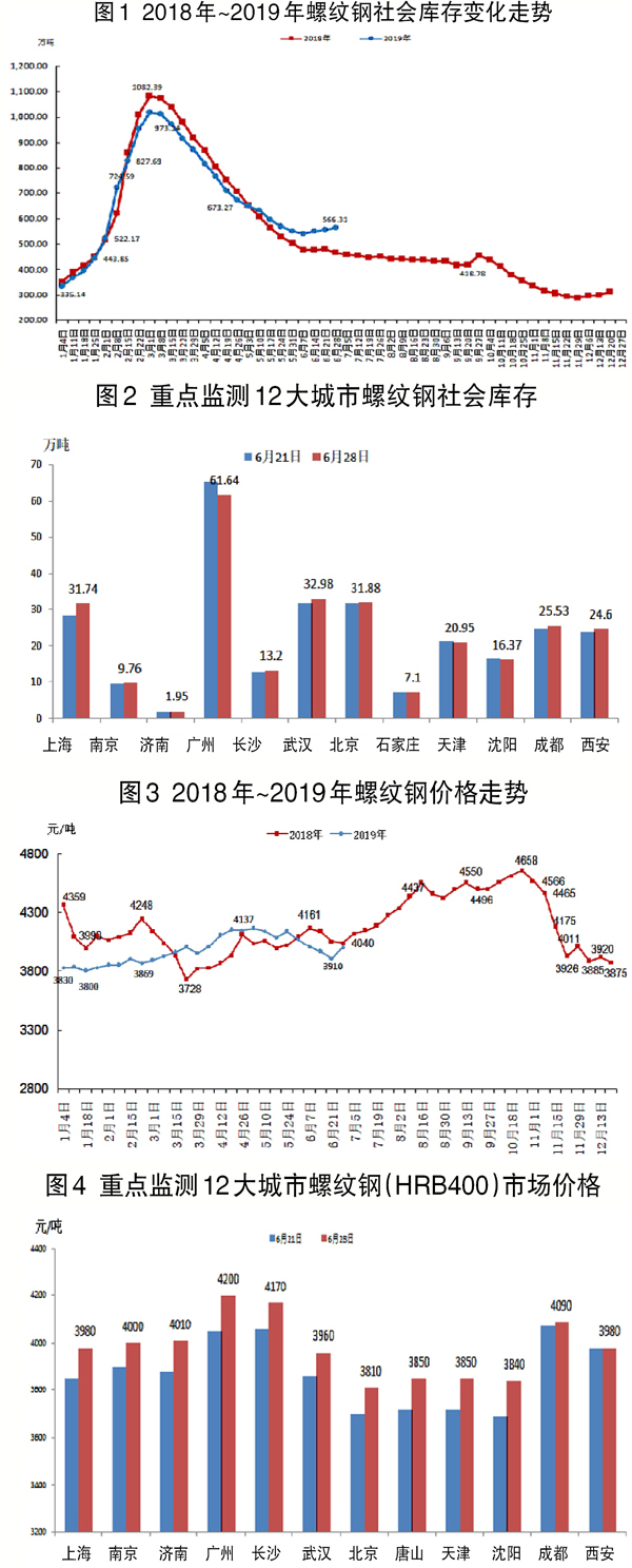 6月24日~6月28日,螺紋鋼社會(huì)庫存為566.31萬噸,環(huán)比上升9.66萬噸,升幅為1.71%。重點(diǎn)監(jiān)測(cè)的12個(gè)城市庫存升降不一,其中廣州下降幅度較大,武漢、上海上升幅度較大。