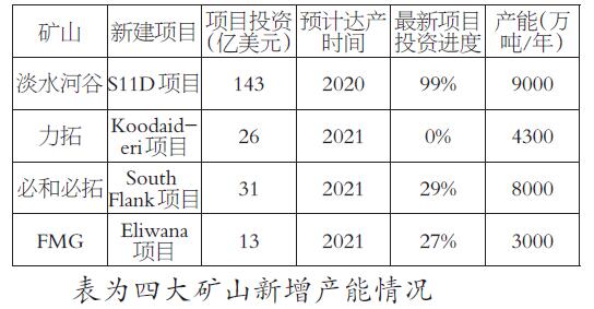 而必和必拓的SouthFlank項(xiàng)目、力拓的Koodaideri項(xiàng)目和FMG的Eliwana項(xiàng)目均將在2021年才會(huì)建成投產(chǎn)。因此,除淡水河谷S11D項(xiàng)目外,2019—2020年四大礦山新建項(xiàng)目產(chǎn)能擴(kuò)張十分有限。