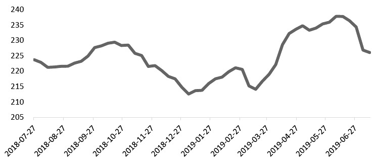 2019年1—5月中國生鐵產(chǎn)量增速高達(dá)8.9%,根據(jù)mysteel周度日均鐵水產(chǎn)量趨勢(shì)推斷,上半年日均鐵水產(chǎn)量在6月中旬見頂,在唐山和邯鄲等地環(huán)保限產(chǎn)影響下,7月日均鐵水產(chǎn)量高位下滑。