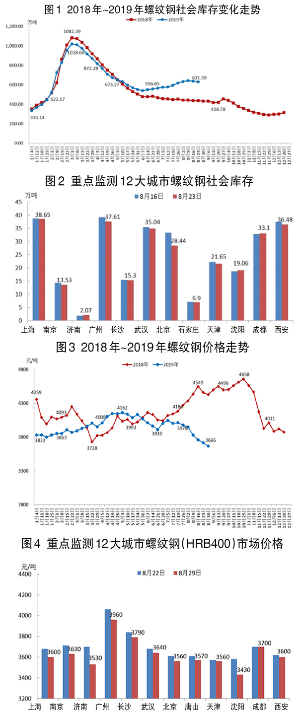 8月26日~8月30日,全國螺紋鋼平均價格為3666元/噸,環比下降53元/噸,降幅為1.42%。重點監測的12個城市價格均下降,其中濟南、沈陽等城市降幅較大。