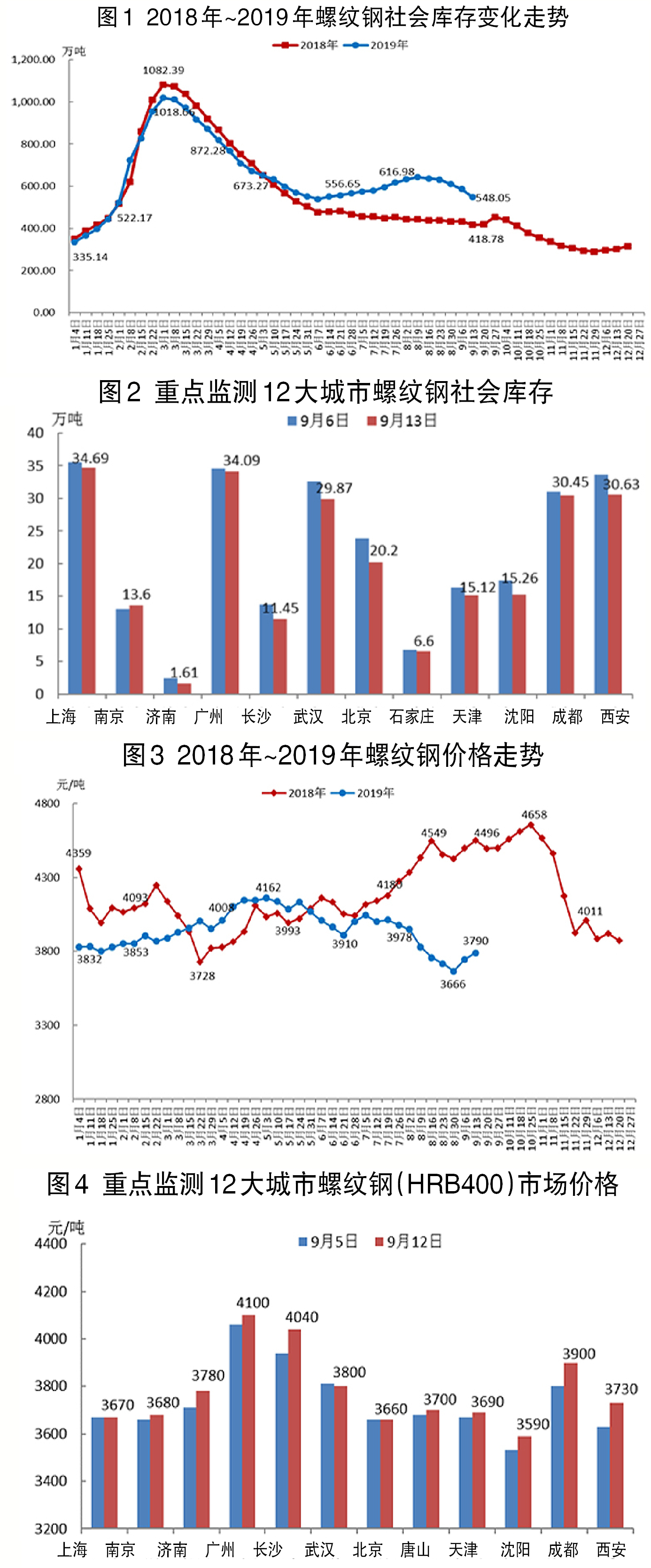 9月9日~9月12日,全國螺紋鋼平均價格為3790元/噸,環(huán)比上升46元/噸,升幅為1.22%。重點監(jiān)測的12個城市跌漲互現(xiàn),其中長沙、成都西安等城市漲幅較大,武漢有所下降。