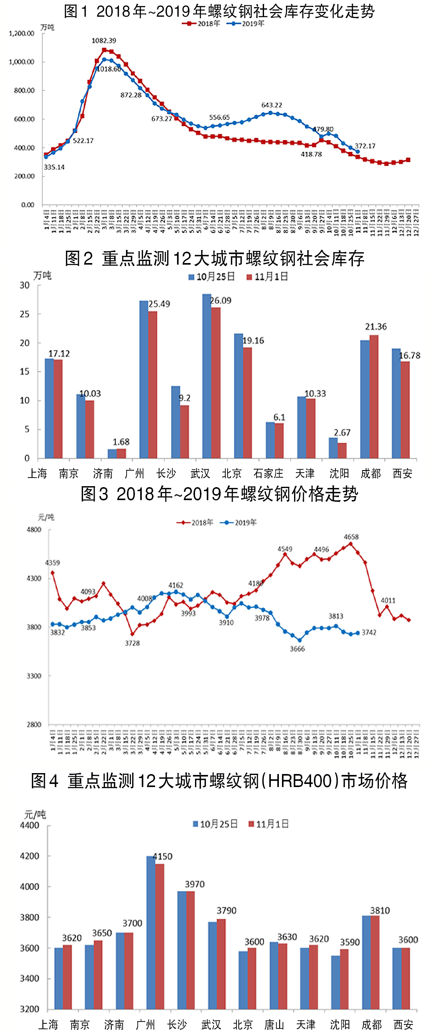 10月28日~11月1日,螺紋鋼社會庫存為372.17萬噸,環(huán)比下降29.09萬噸,降幅為7.25%。重點監(jiān)測的12個城市庫存升降不一,其中長沙、北京、武漢等城市降幅較大,成都等城市升幅較大。
