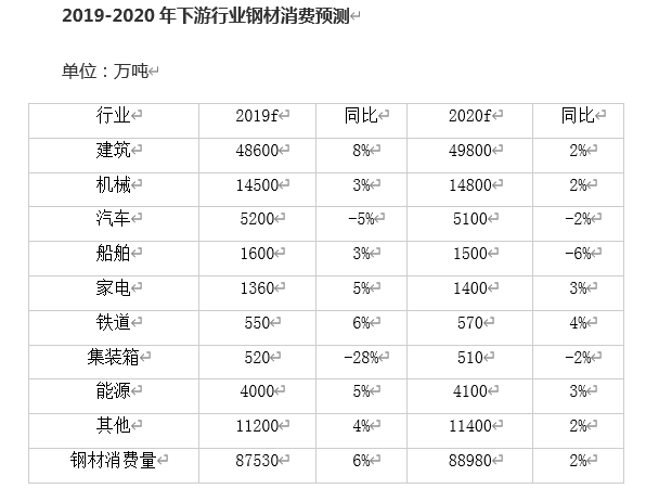2019年鋼鐵行業(yè)市場需求較好,主要得益于基建、房地產(chǎn)等下游行業(yè)的穩(wěn)定運(yùn)行,但各行業(yè)發(fā)展情況并不相同,其中基建行業(yè)投資保持低速平穩(wěn)增長,房地產(chǎn)投資、新開工保持較高速度增長,機(jī)械行業(yè)平穩(wěn)運(yùn)行,汽車行業(yè)持續(xù)低迷,造船行業(yè)三大指標(biāo)兩降一升,家電行業(yè)保持增長趨勢,集裝箱行業(yè)陷入低迷,預(yù)計2019年鋼材消費(fèi)量約8.8億噸,同比增長6%。