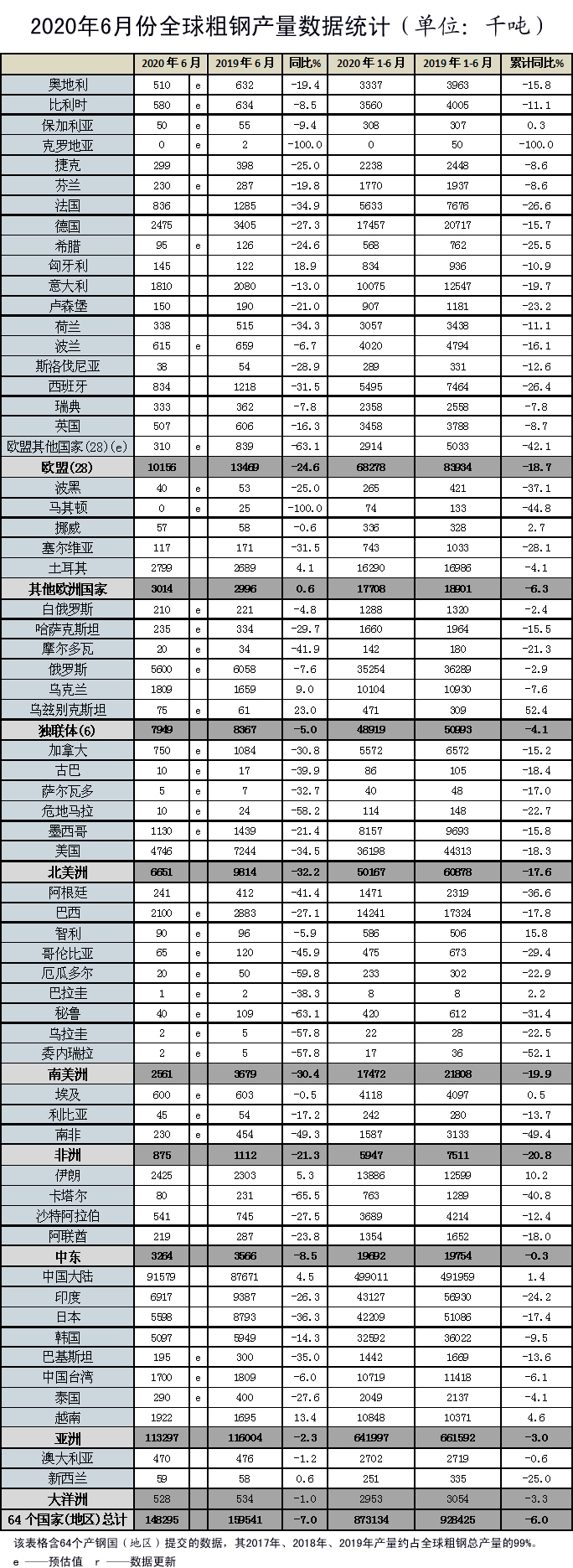 6月份,亞洲粗鋼產(chǎn)量為1.13億噸,同比下降2.3%;歐盟粗鋼產(chǎn)量為1016萬(wàn)噸,同比下降24.6%;北美洲粗鋼產(chǎn)量為665萬(wàn)噸,同比下降32.2%;南美洲粗鋼產(chǎn)量為256萬(wàn)噸,同比下降30.4%;中東地區(qū)粗鋼產(chǎn)量為326萬(wàn)噸,同比下降8.5%;獨(dú)聯(lián)體的粗鋼產(chǎn)量為795萬(wàn)噸,同比下降5.0%。