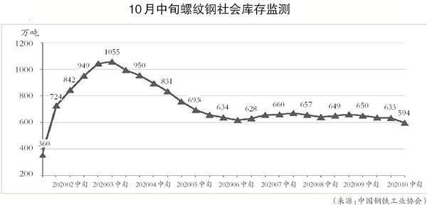 中國鋼鐵工業協會統計數據顯示,截至10月中旬,全國螺紋鋼社會庫存達594萬噸,旬環比減少39萬噸,下降6.2%,連續5旬呈下降態勢(如圖)。螺紋鋼是同期社會庫存環比減量和降幅最大的鋼材品種。這也間接表明了螺紋鋼需求旺盛。