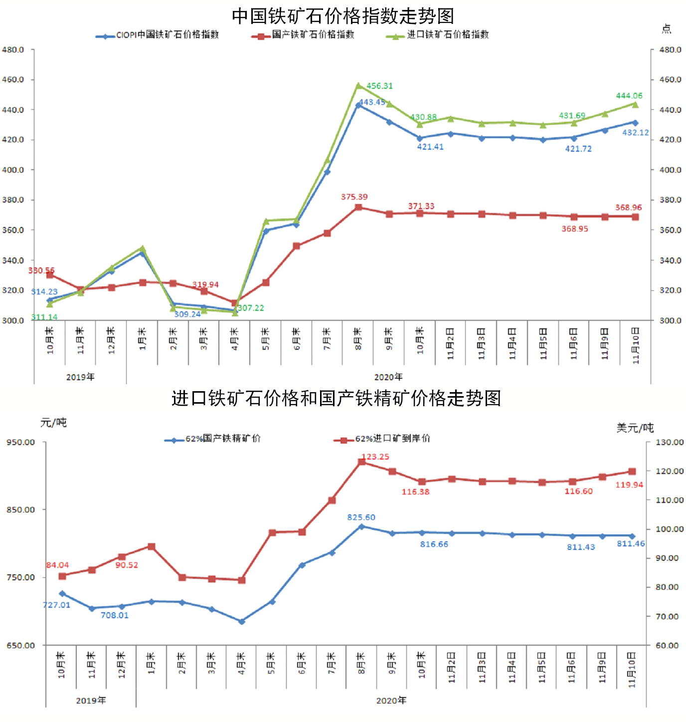 從全月情況看,國產鐵精礦平均含稅價格為821.15元/噸,比9月份下降12.66元/噸,降幅為1.52%;進口粉礦平均到岸價格為118.29美元/噸,比9月份下降4.47美元/噸,降幅為3.64%。